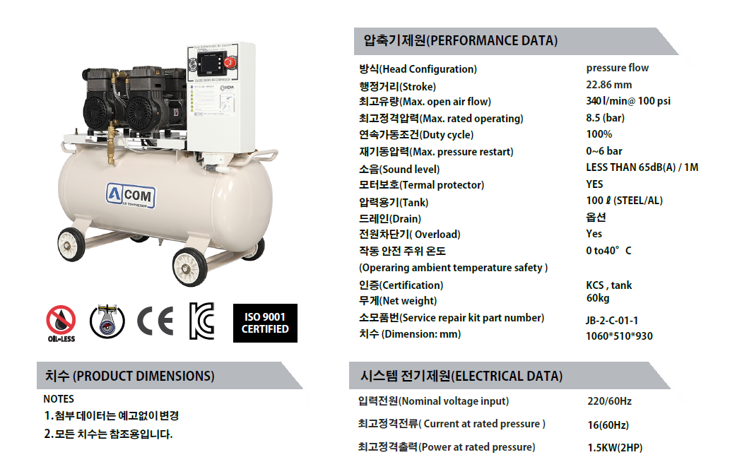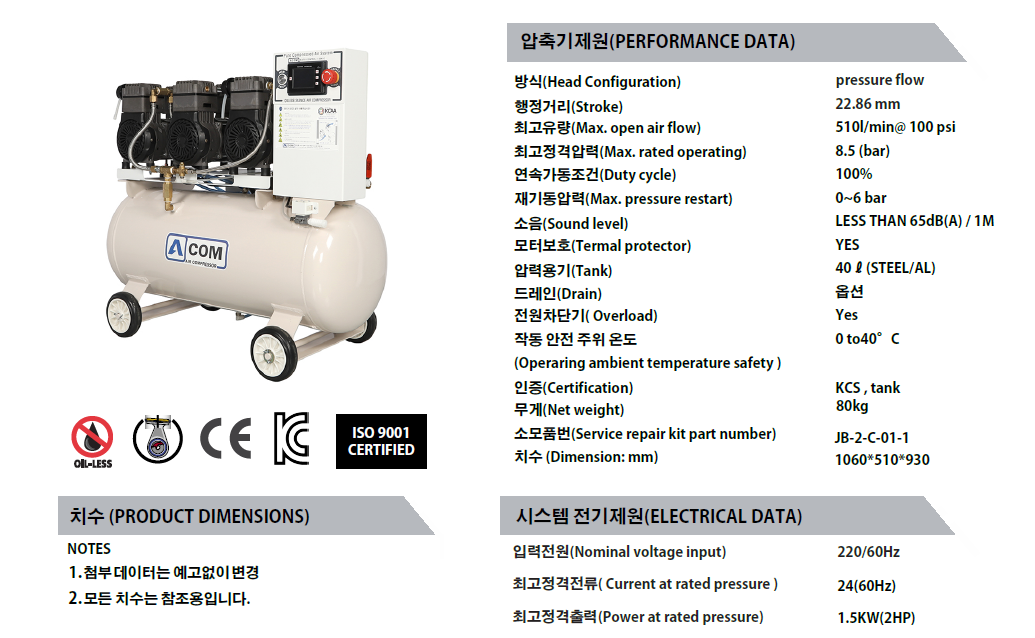 에이콤의 새로운 오일레스 2HP 콤프레셔는 뛰어난 성능과 내구성을 바탕으로 다양한 환경조건 설계와 개선사양